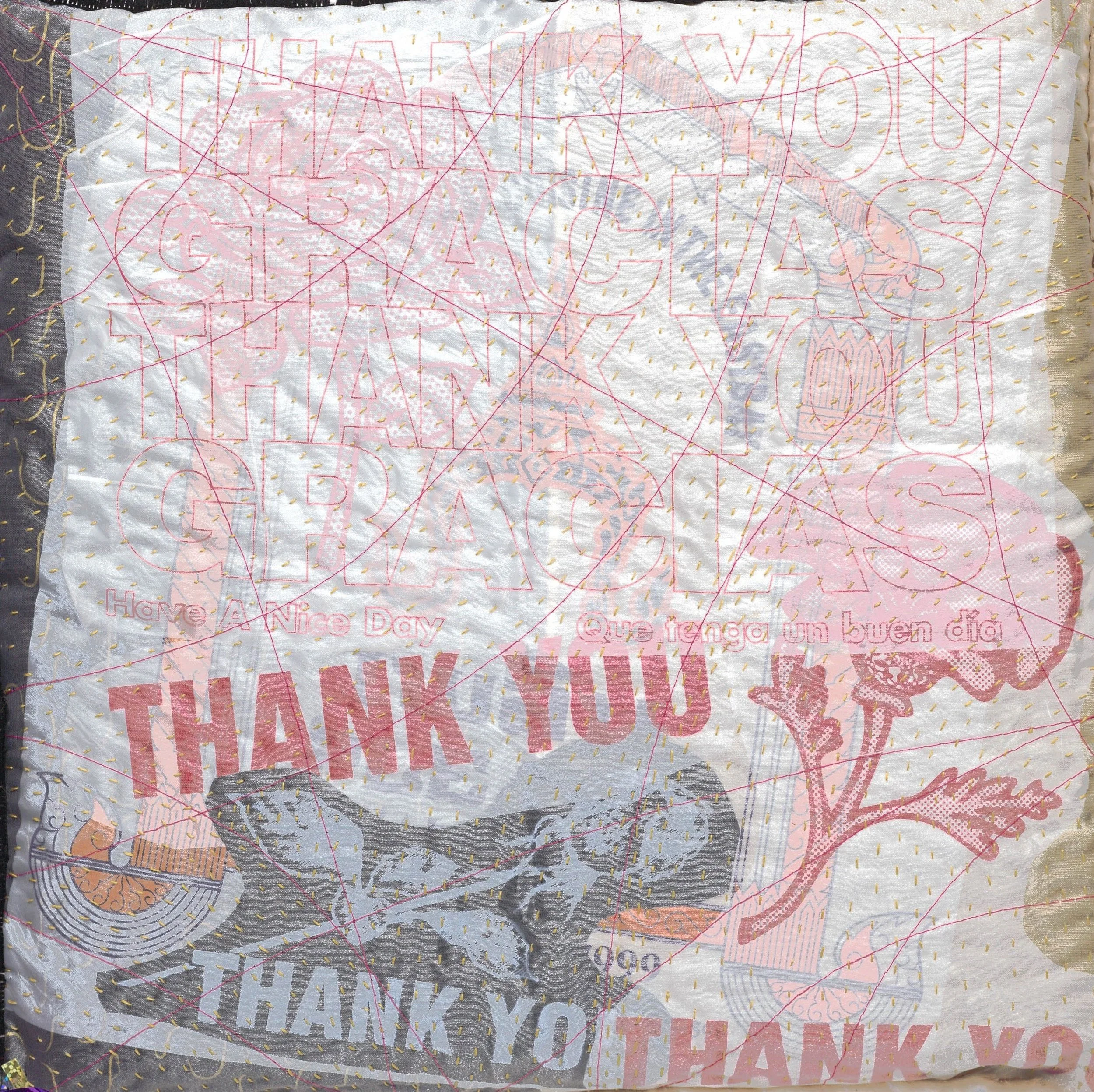 Amalgamation - Thank You (detail), Mixed Media Pillows, 2025, approx. 12” x 12” (photo by Tony Molatore)