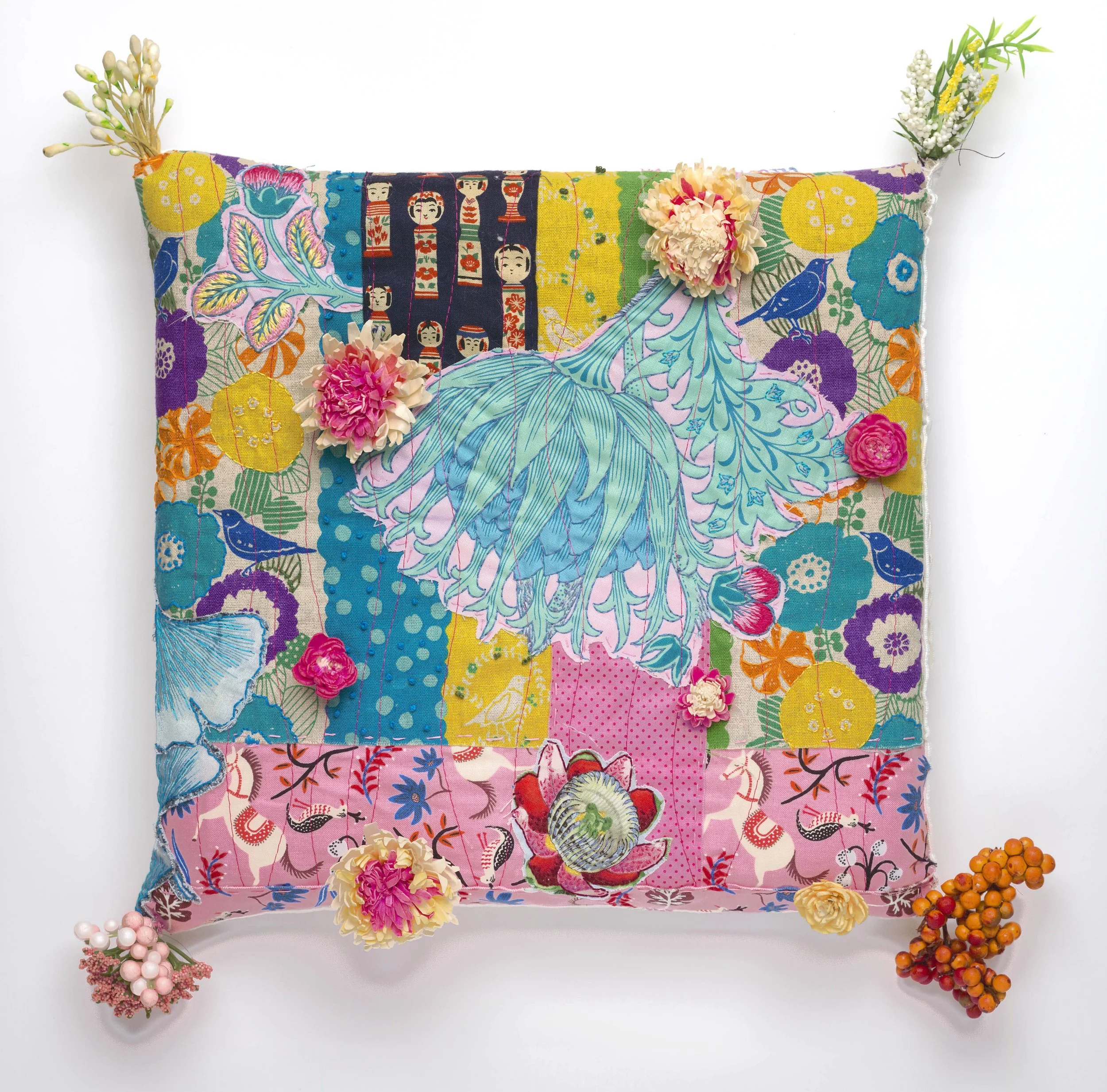 Amalgamation - Flora, Mixed Media Pillows, 2025, approx. 12” x 12” (photo by Tony Molatore)